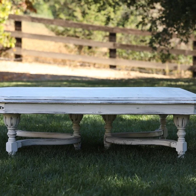 Wooden, white coffee table with sculpted base and legs. It really is darn cute! 48"x24.5" oval by 21" high.