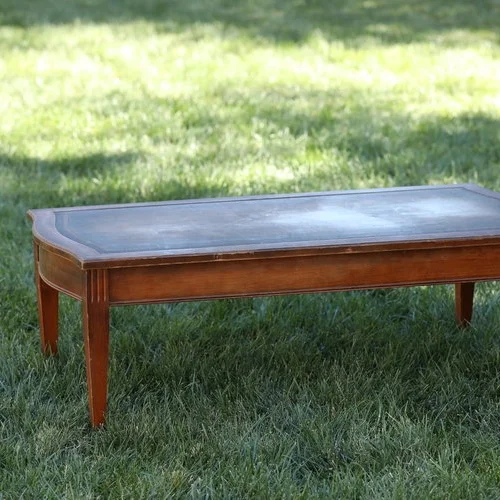 Mid Century Modern, wooden, leather sculpted top, coffee table with cute metal feet. 44" x 21" rectangle by 16" high.