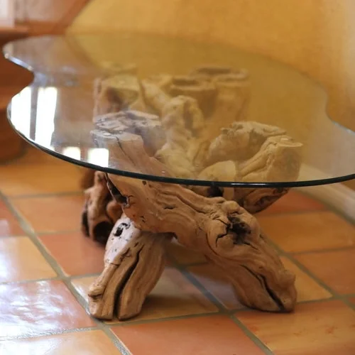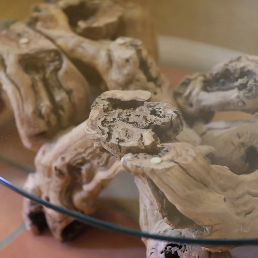 Smaller version of Brutus. Grapevine table with a kidney shaped glass top. 15” high x 42” long x 25” wide.