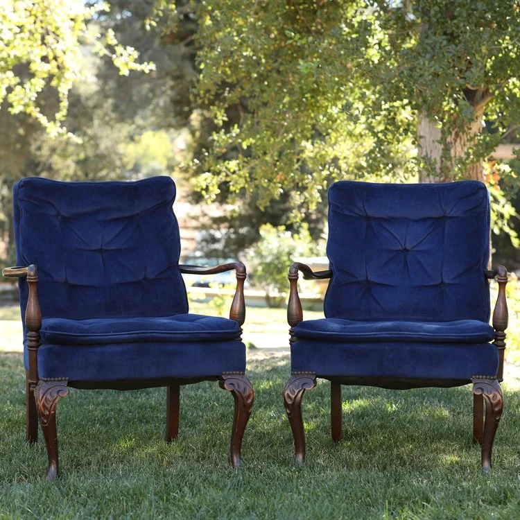 Navy blue velvet chairs, with wooden arms. Seat 24"x28" by 35" tall. Great pair for a sweetheart table.